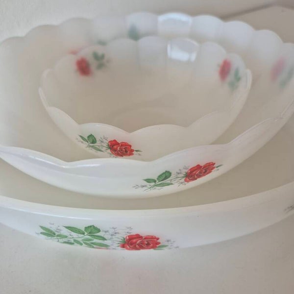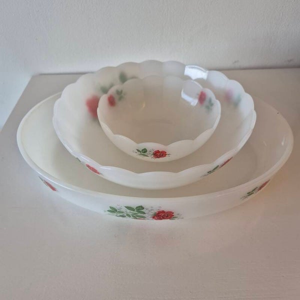 Prachtige set van Arcopal, met prachtige rozenprint. 3 Schalen Set