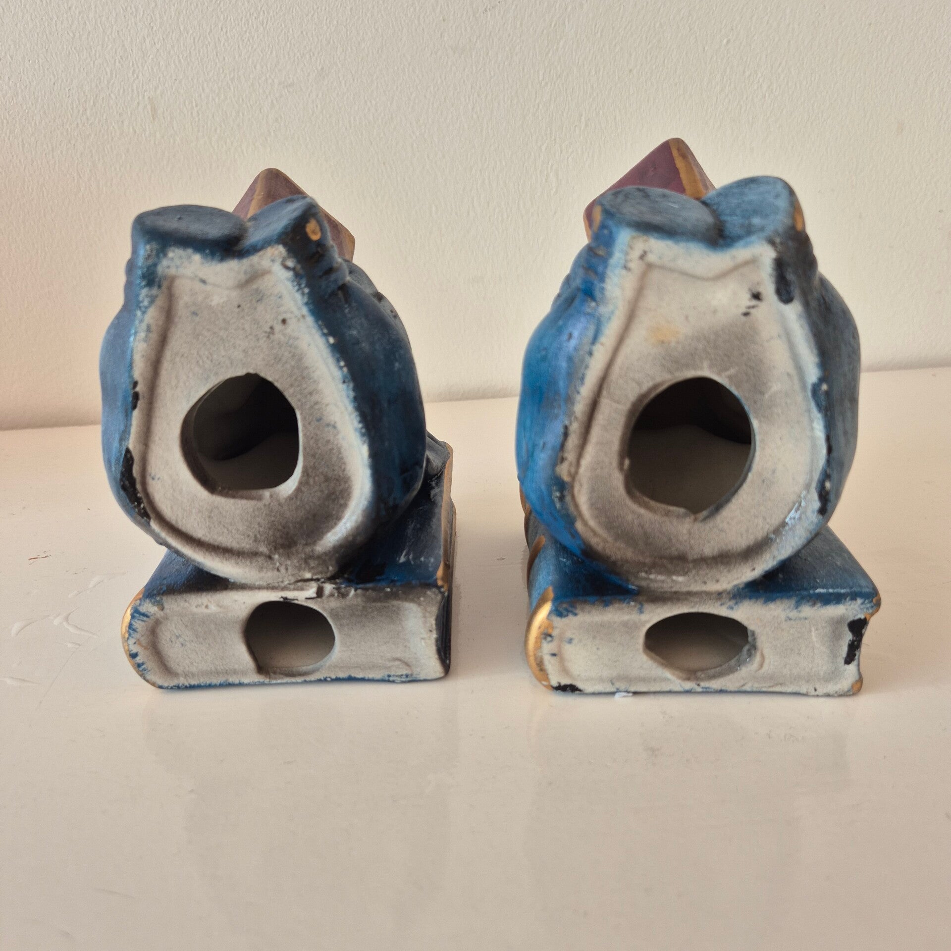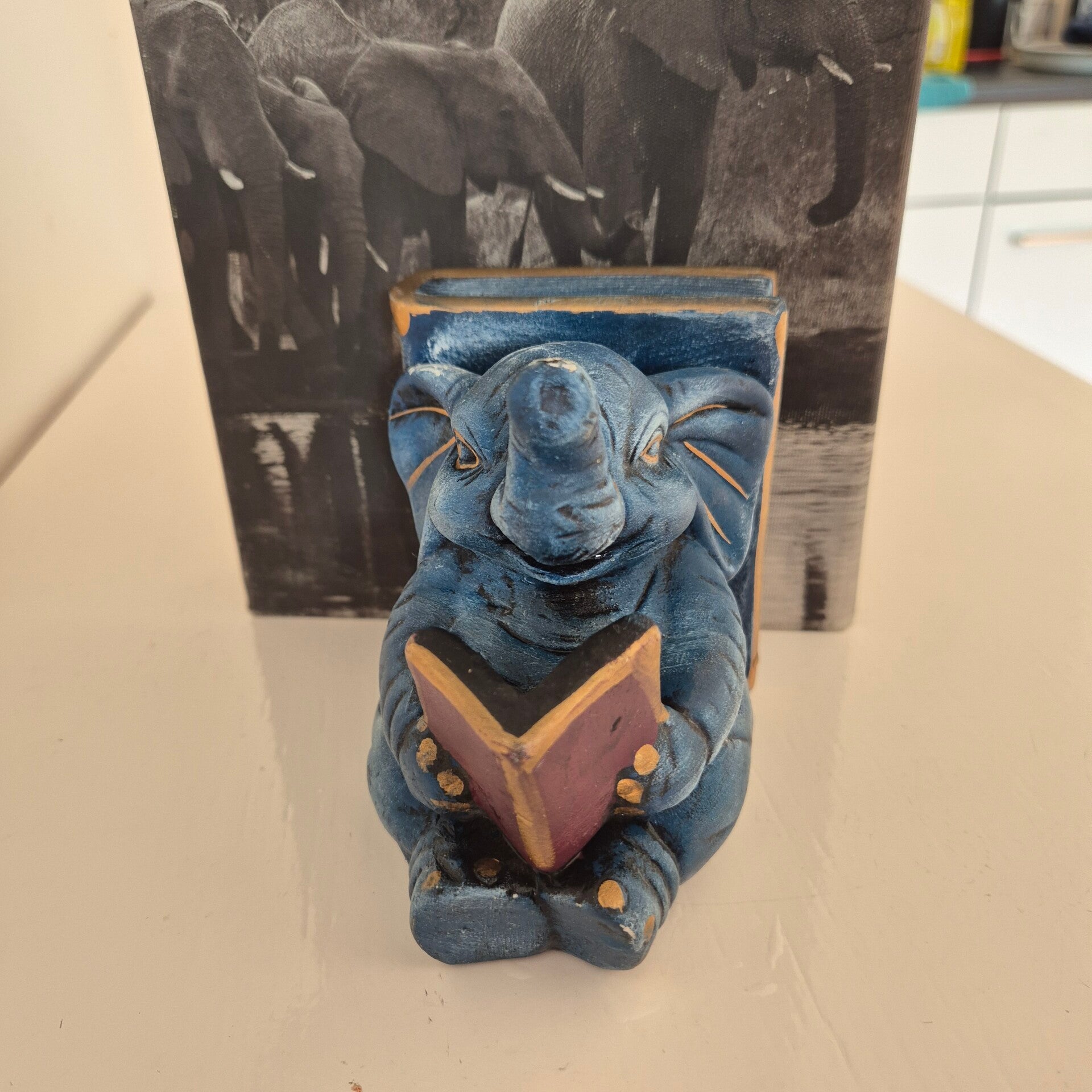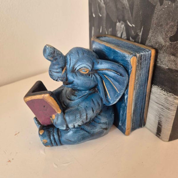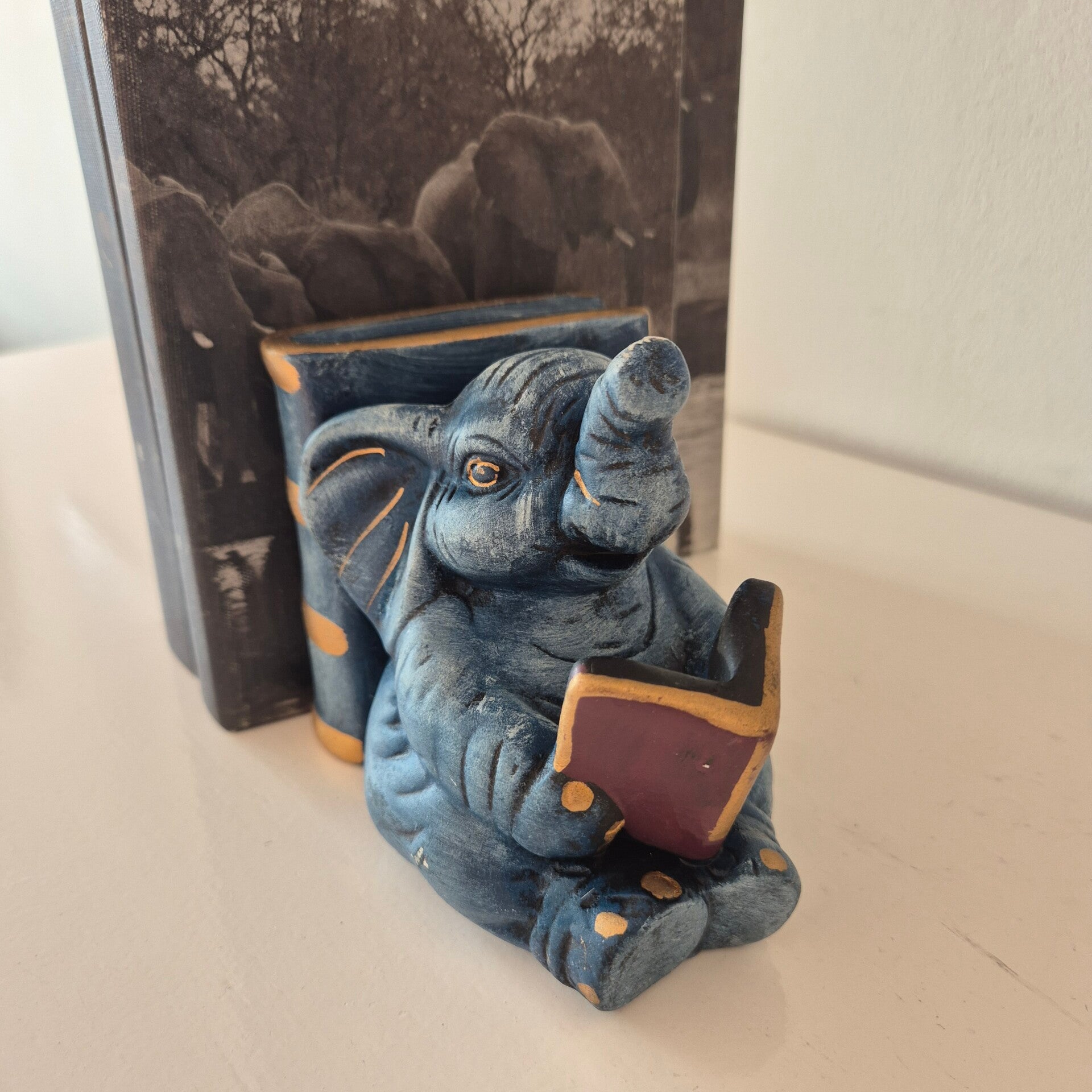 Prachtige set boekensteunen van 2 olifantjes in blauw met goudkleur. Lezende olifantjes.