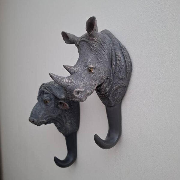 Ben je op zoek naar een unieke Touch voor je Interieur? Dan zijn deze unieke jassenhaken echt iets voor jou! Jassenhaken in de vorm van majestueuze dierenkoppen. De krachtige waterbuffel en de indrukwekkende Neushoorn. Deze robuuste en toch elegante haken zijn niet alleen een praktische oplossing voor je jassen, tassen of sjaals, maar ook een absolute blikvanger die je muur tot leven brengt.