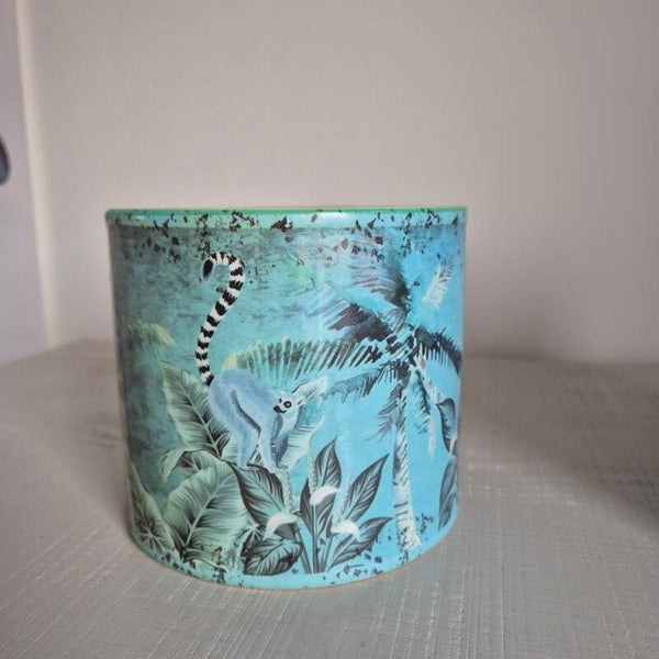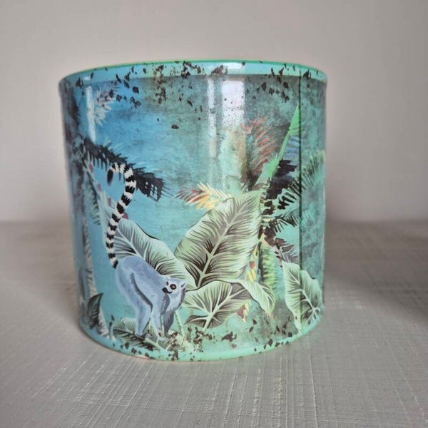 Ontwerp (linker pot):De linker bloempot toont een illustratie van een ringstaartmaki die op een tak zit tussen grote bladeren en andere tropische planten.