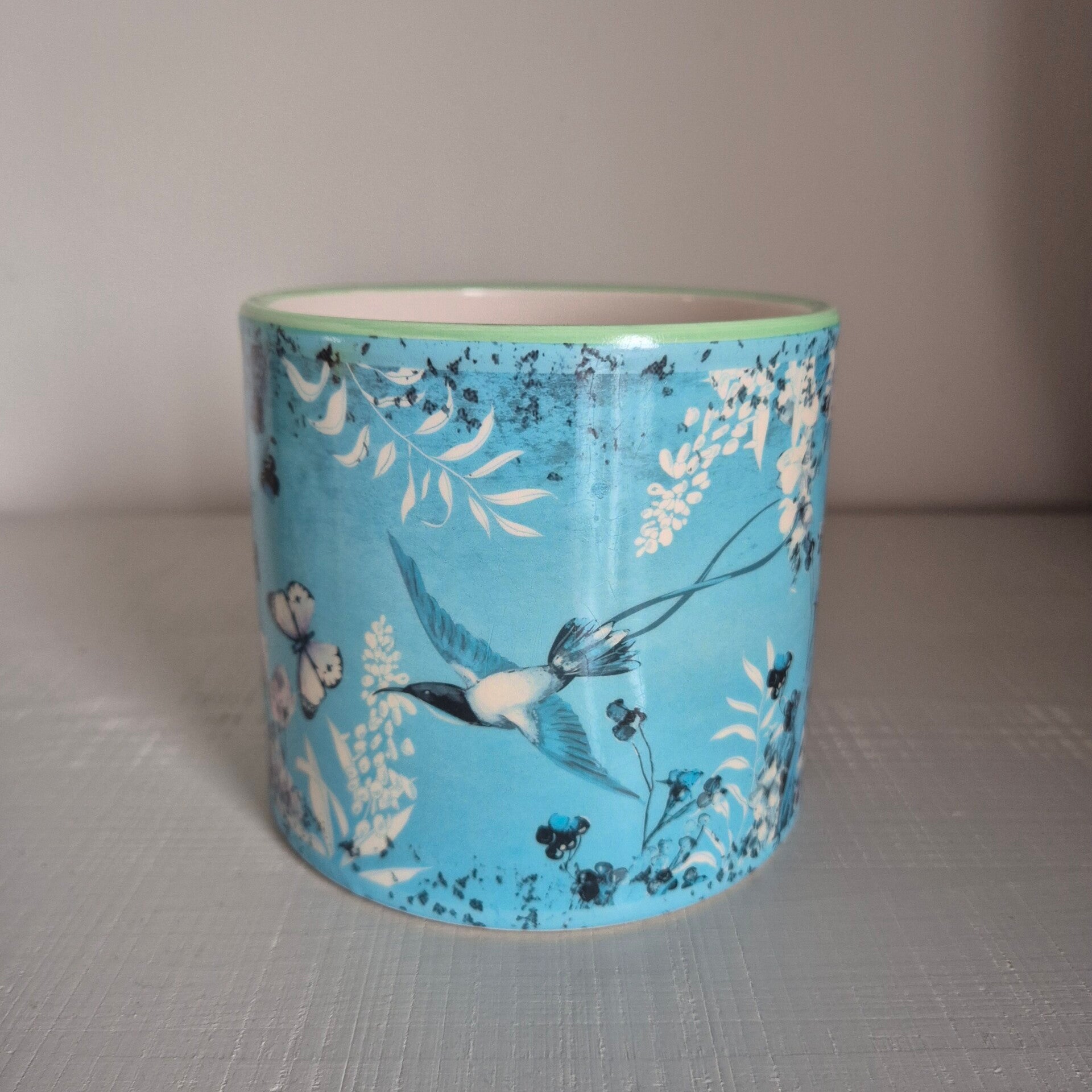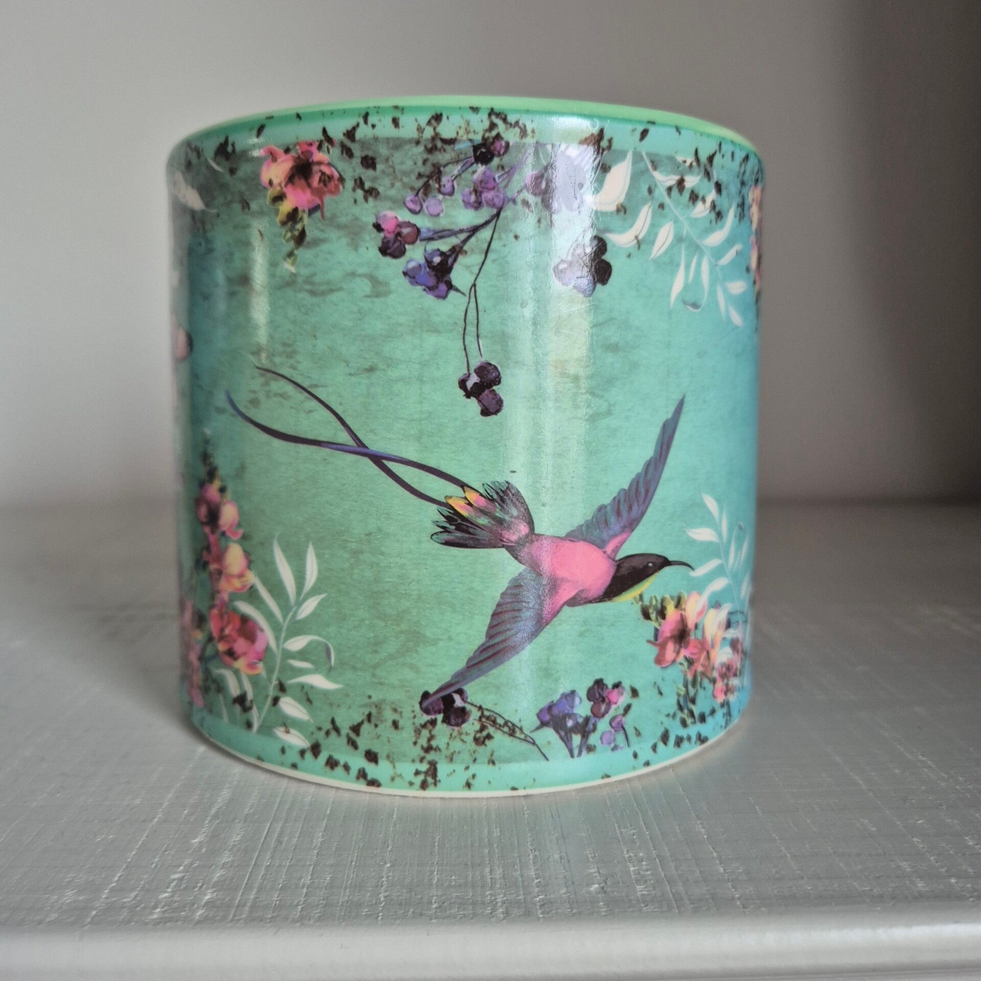 Ontwerp (rechter pot):De rechter bloempot heeft een illustratie van een kolibrie in vlucht, omringd door vlinders en diverse bladeren en bloemmotieven.