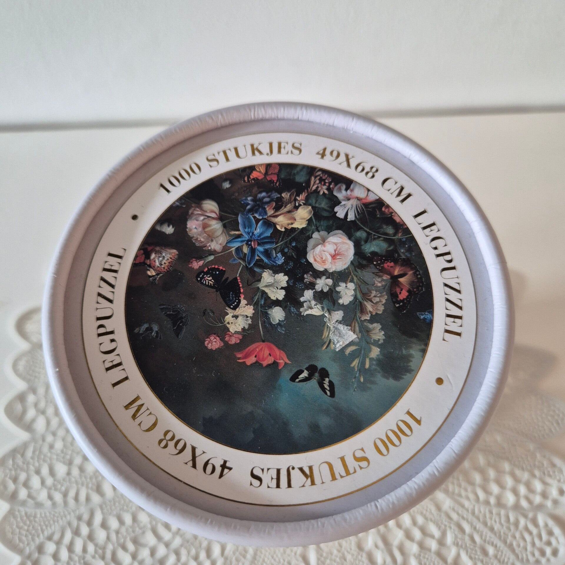 - Motief: De puzzelafbeelding toont een gedetailleerd bloemstilleven met vlinders.