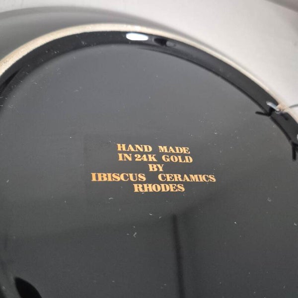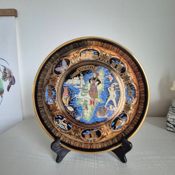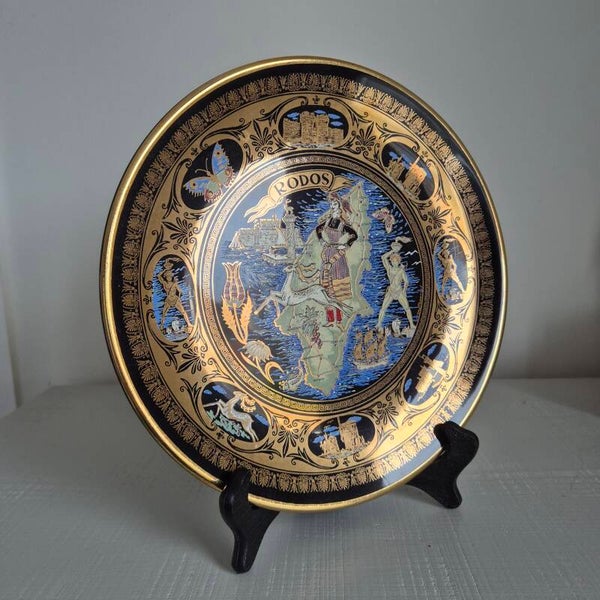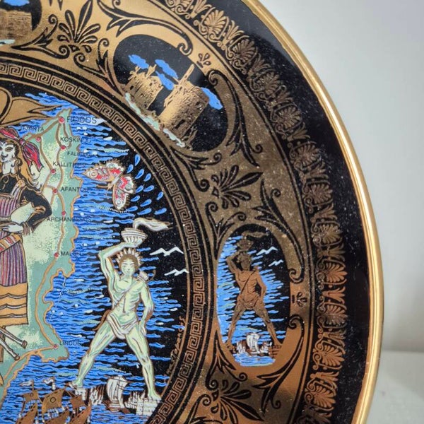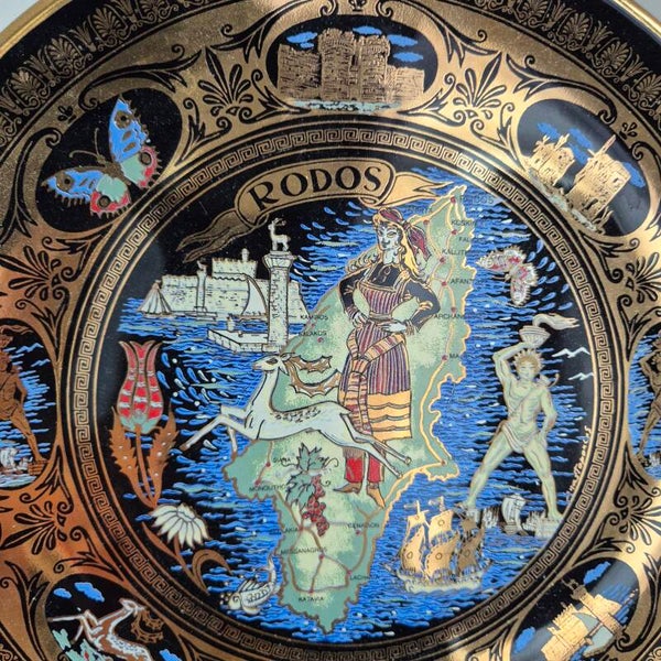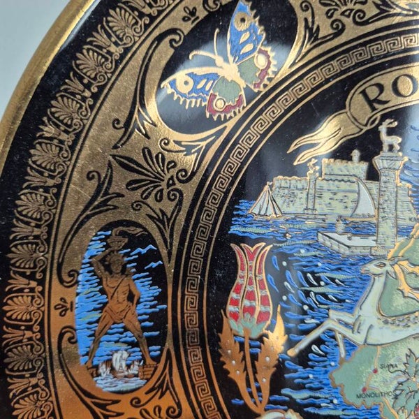 Dit is een vintage, handgemaakt Grieks decoratief bord dat de geschiedenis en mythologie van het eiland Rhodos (Rodos) weergeeft, voorzien van 24-karaats gouden accenten.