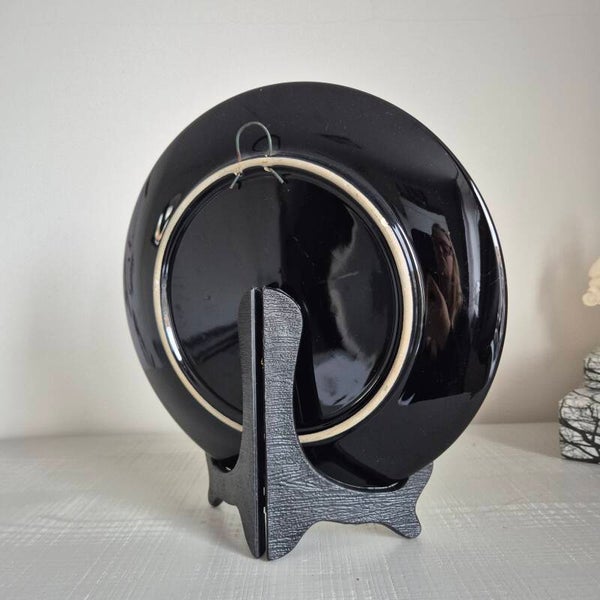 Het bord heeft een opvallende zwarte achtergrond en is rijkelijk versierd met goudkleurige en veelkleurige afbeeldingen.