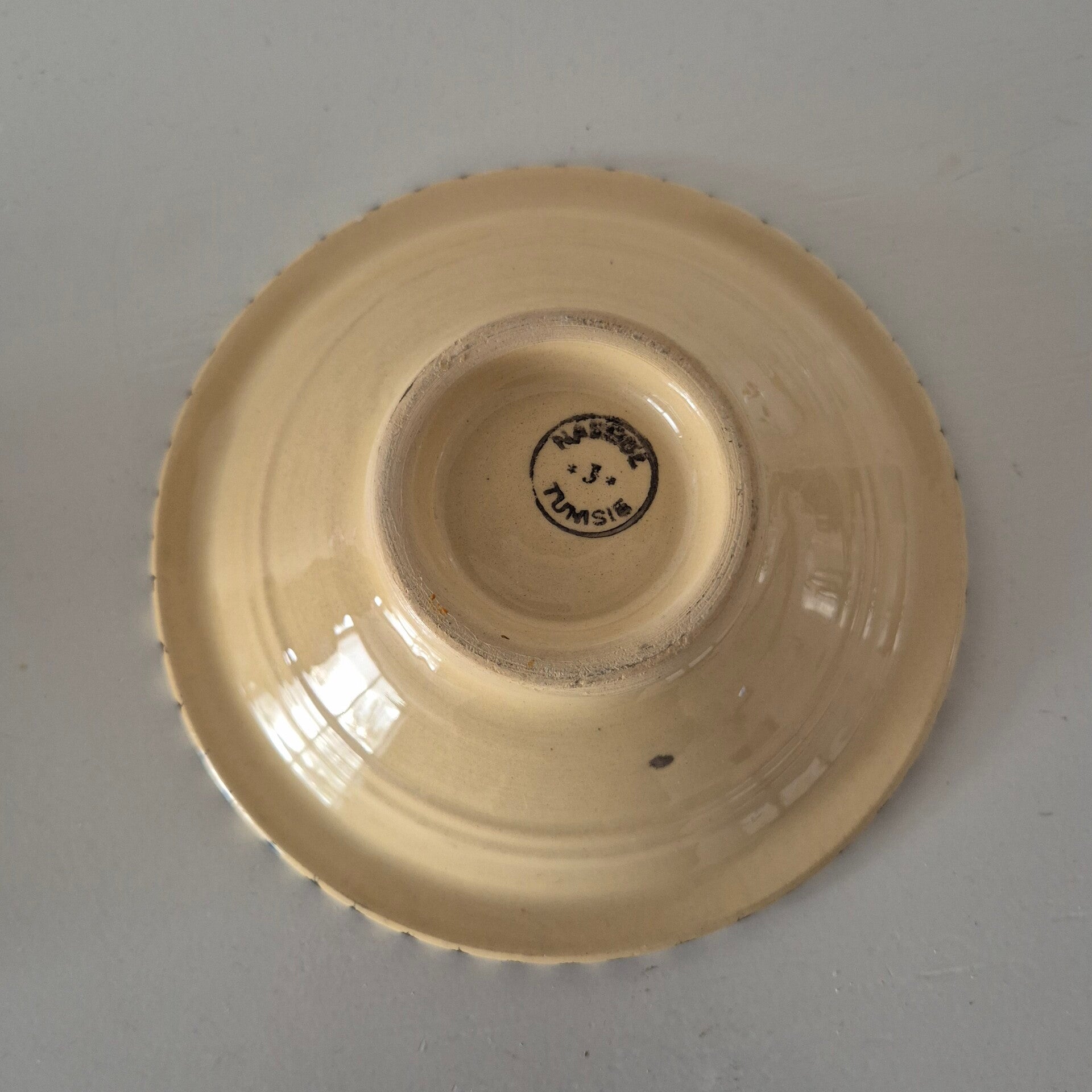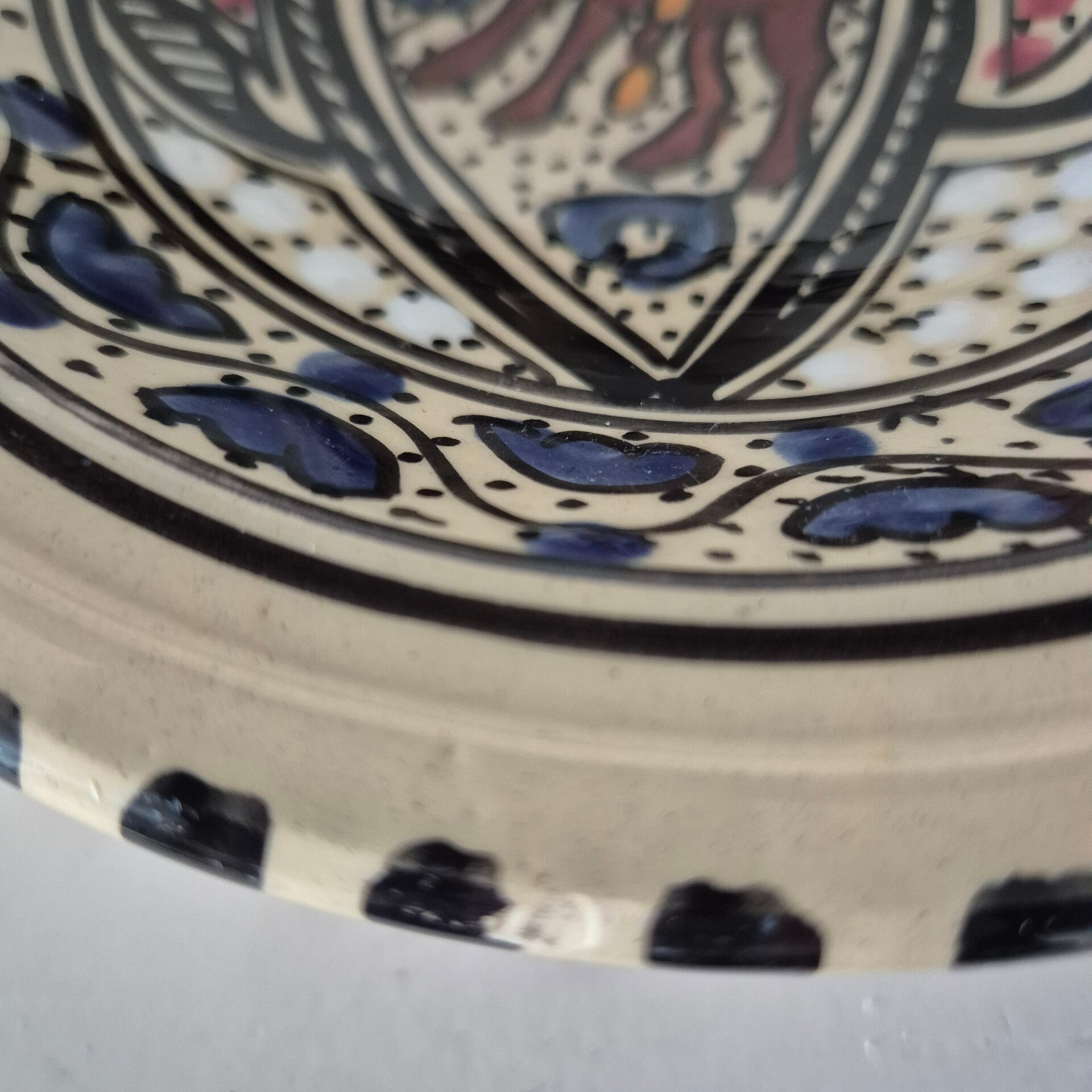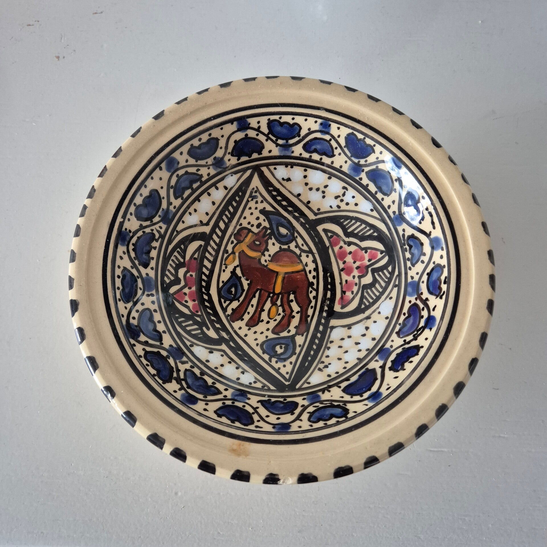 Een prachtige handgemaakte, beschilderde aardewerken schaal, afkomstig uit Tunesië, Noord-Afrika, ambachtelijke tradities.