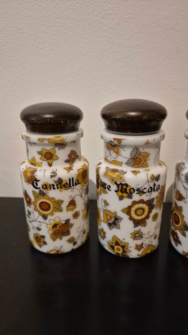 - Materiaal: Opaalglas (potjes), hout (deksels).