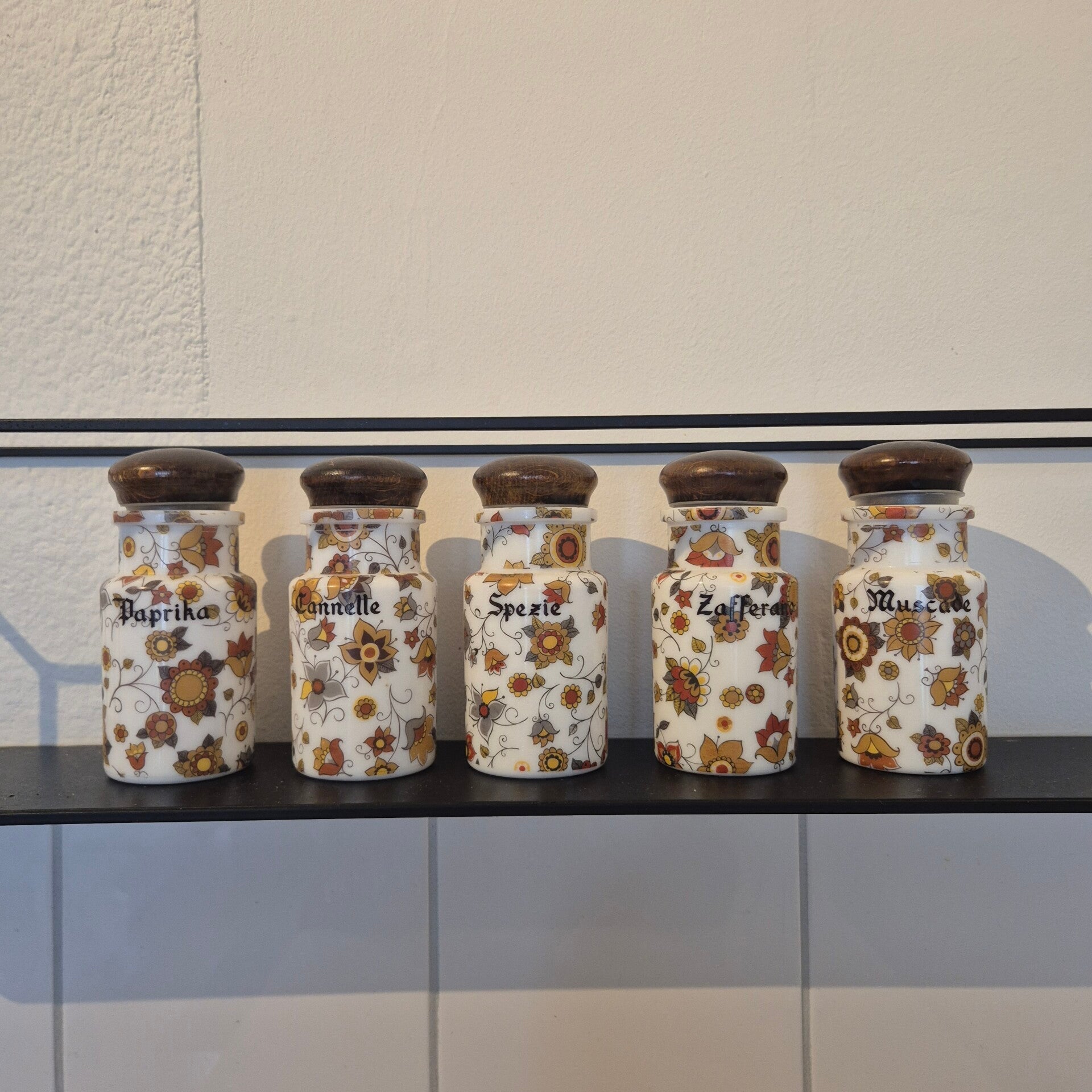 - Etiketten: De labels op de potjes zijn in het Italiaans en omvatten onder andere "Cannella" (Kaneel), "e Moscato" (Nootmuskaat), "Saffran" (Saffraan) en "Paprika".