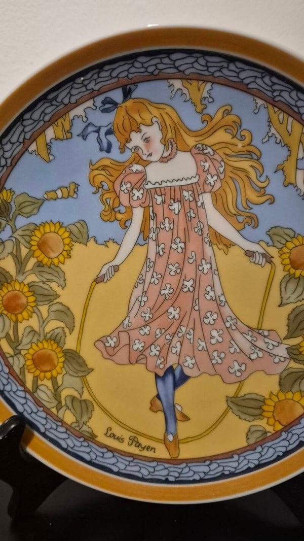 Dit is een Heinrich Porzellan wandbord, gemaakt voor de UNICEF 'Kinderen van de Wereld' collectie, ontworpen door de kunstenaar Louis Payen. Dit specifieke bord is nummer 1 in de serie en vertegenwoordigt 'Europa', met een afbeelding van een meisje dat touwtjespringt tussen zonnebloemen.