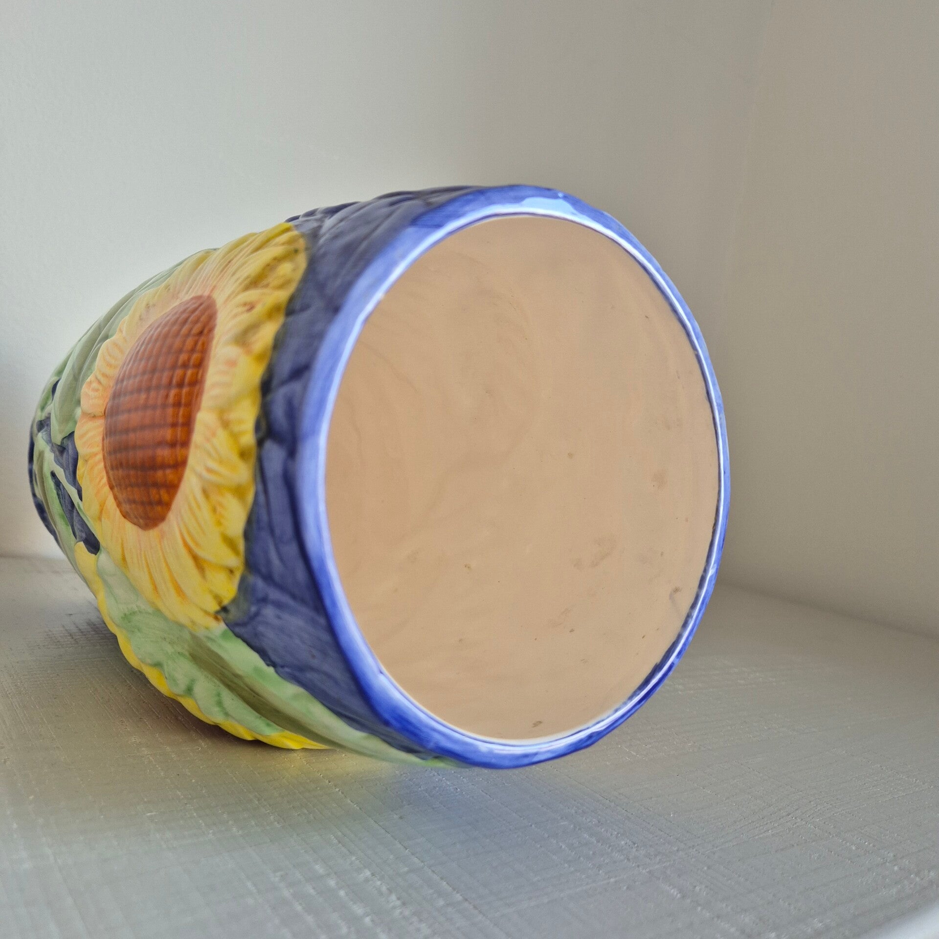 Breng het zonnetje in huis met deze prachtige vintage majolica vaas! Deze eyecatcher uit de jaren '60/'70 valt direct op door het gedetailleerde hoogreliëf van zonnebloemen tegen een diepe, kobaltblauwe achtergrond. Het glanzende glazuur geeft de vaas een luxe, ambachtelijke uitstraling die perfect past in een Cottagecore of modern eclectisch interieur.