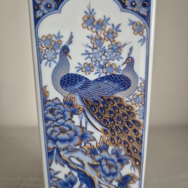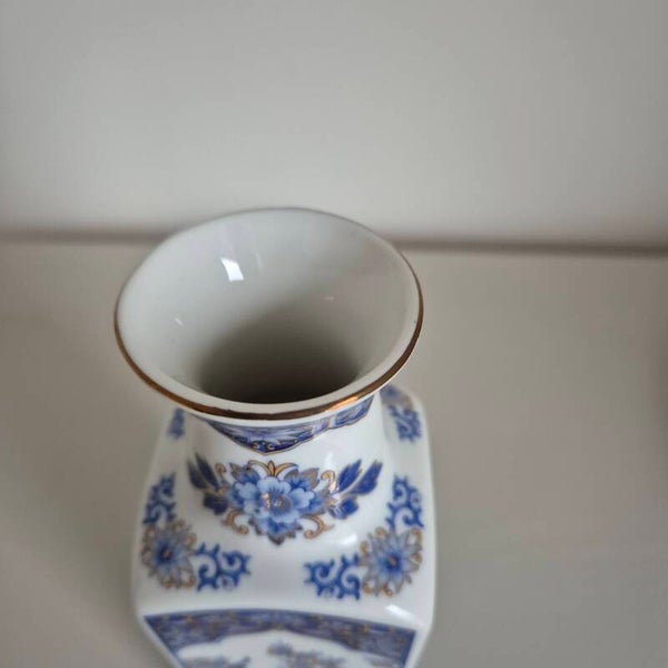 - Techniek: Het is een transferprint (drukdecor) in "Blue and White" (sometsuke), die is opgehoogd met goudaccenten (vergulding). Dit geeft de vaas een luxe uitstraling.