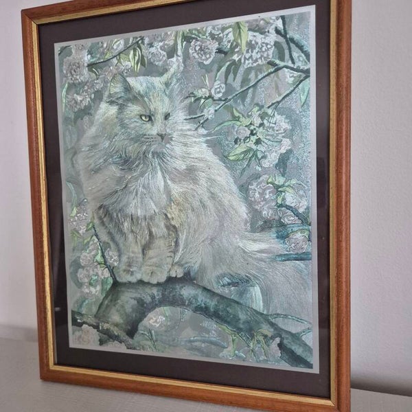 - Onderwerp: Het is een klassiek romantisch beeld van een langharige kat (waarschijnlijk een Perzische kat of een Noorse Boskat) in een bloesemboom.