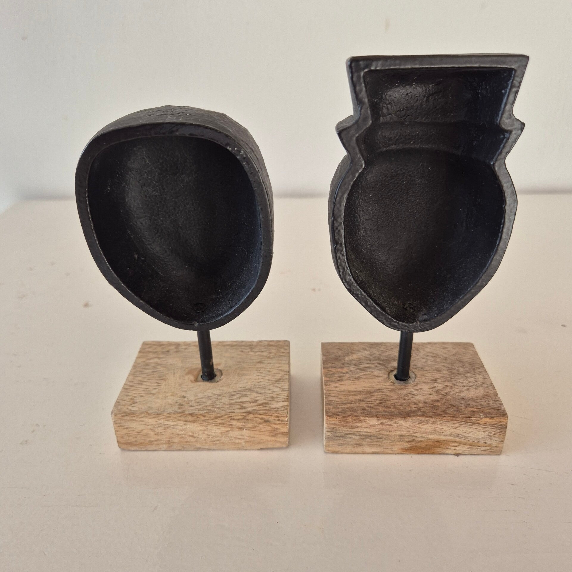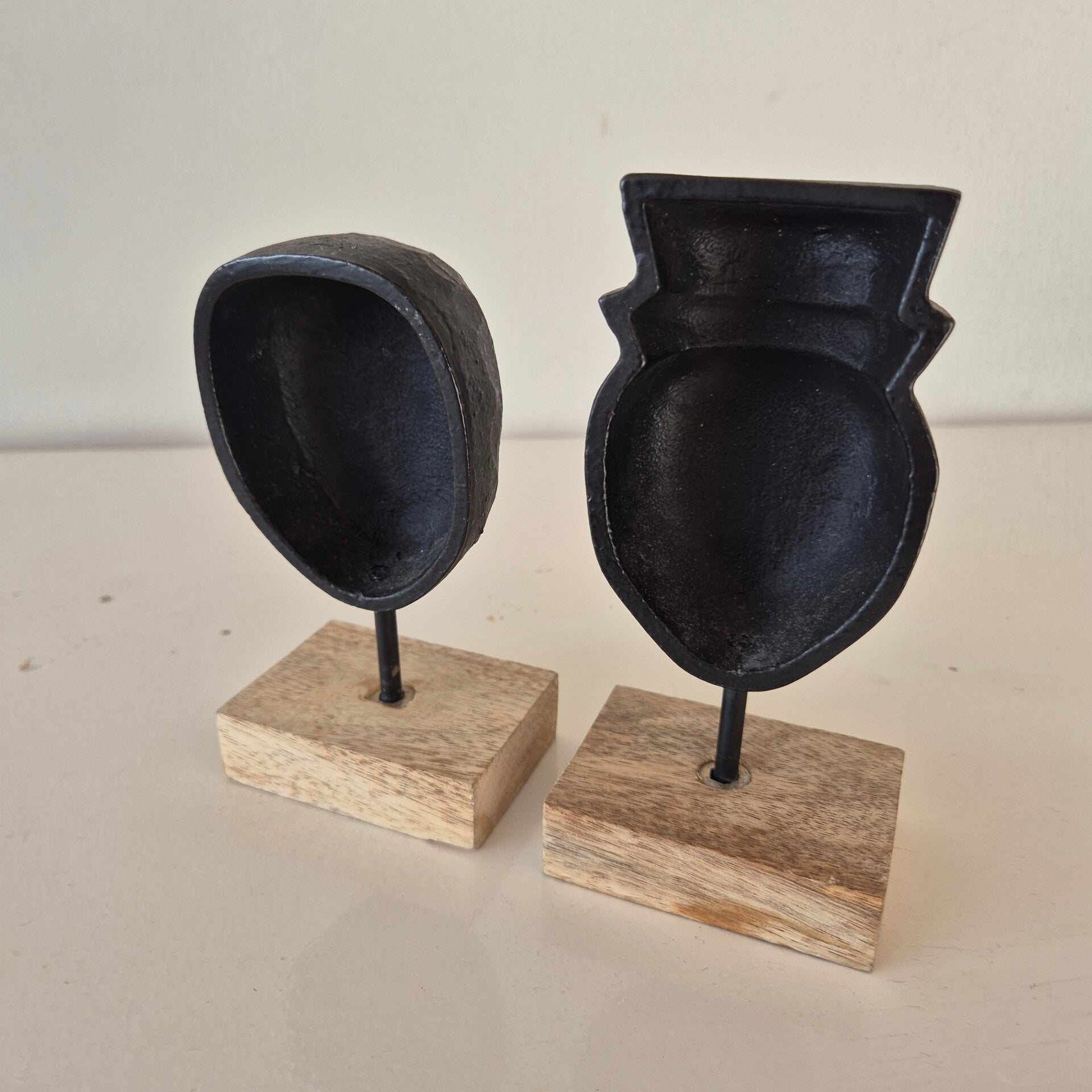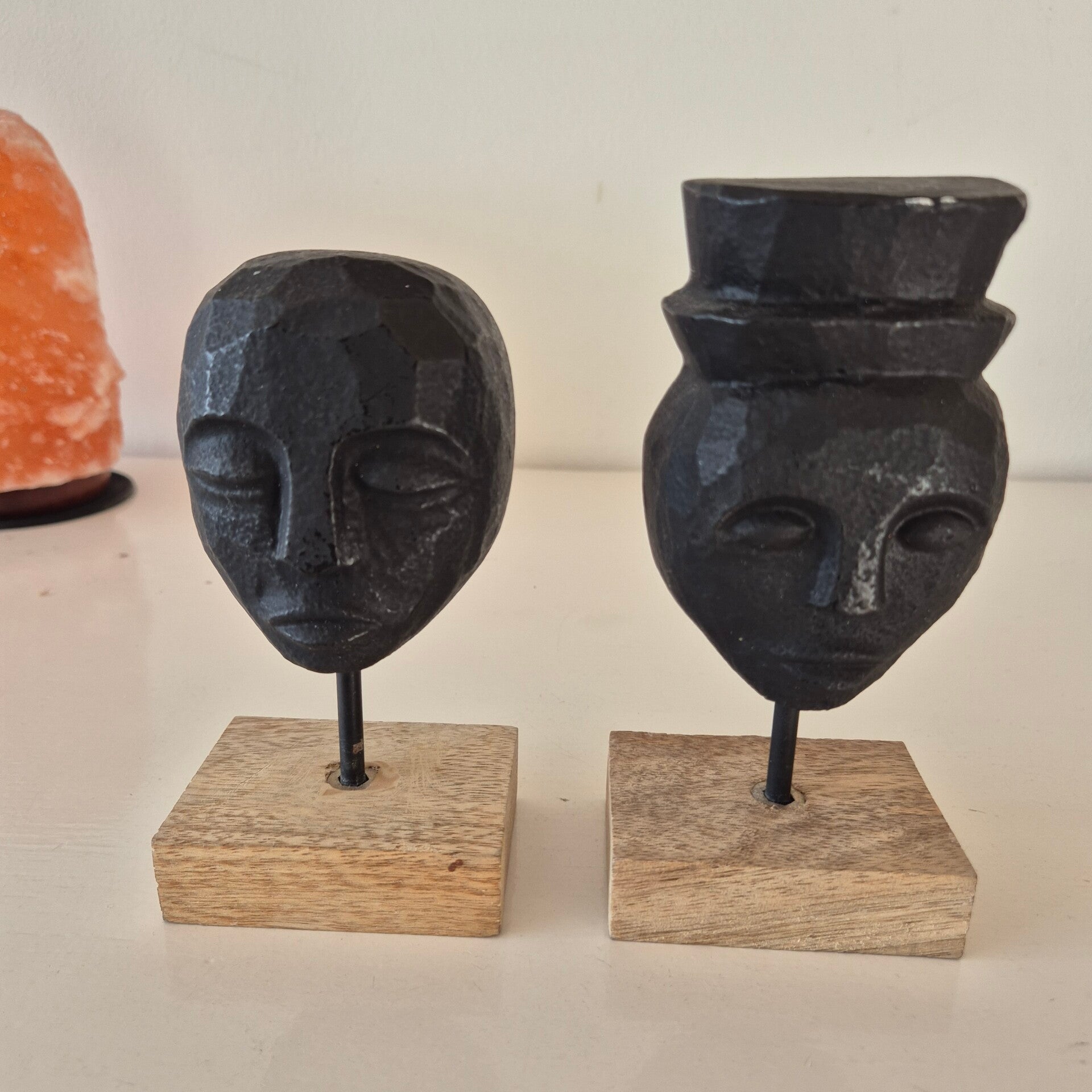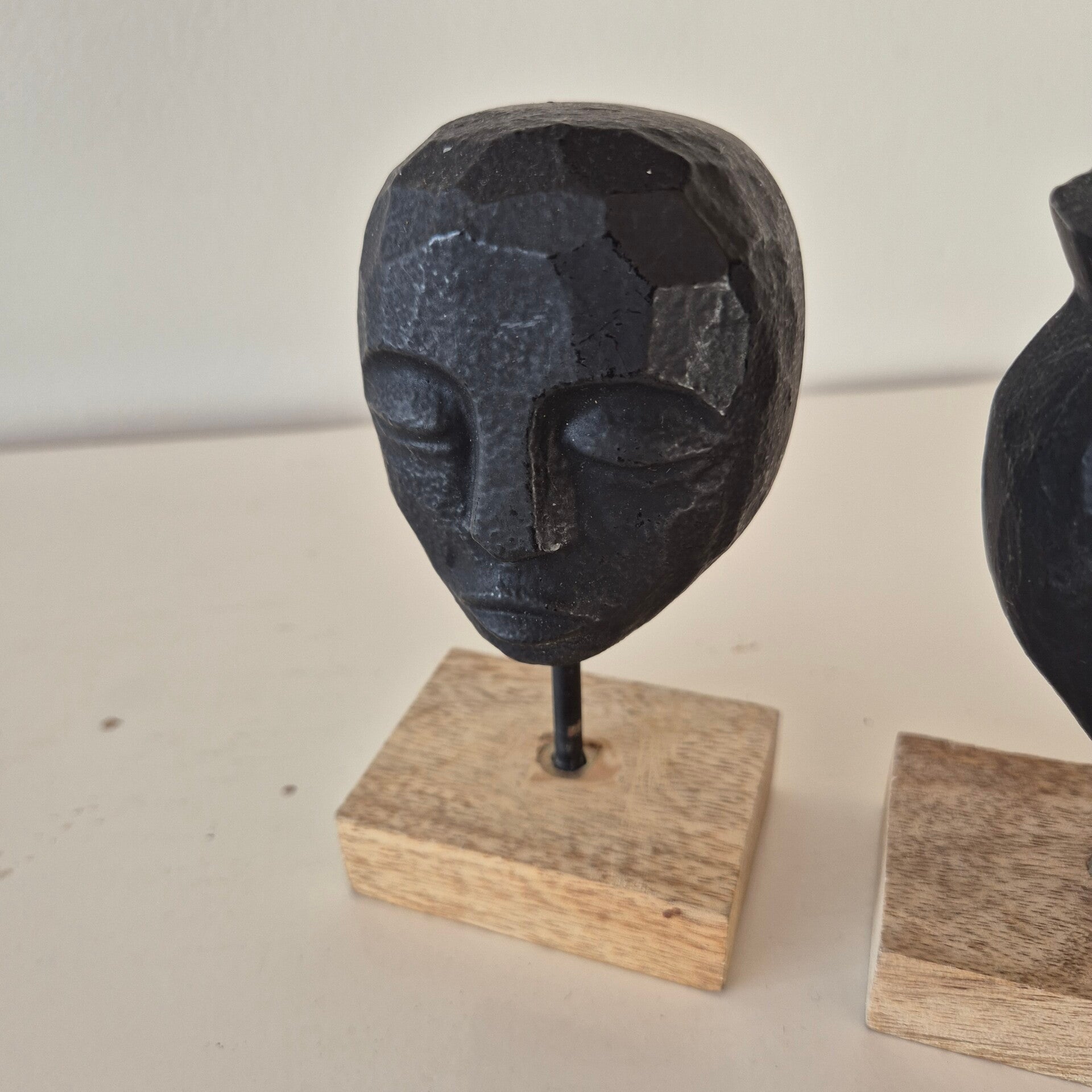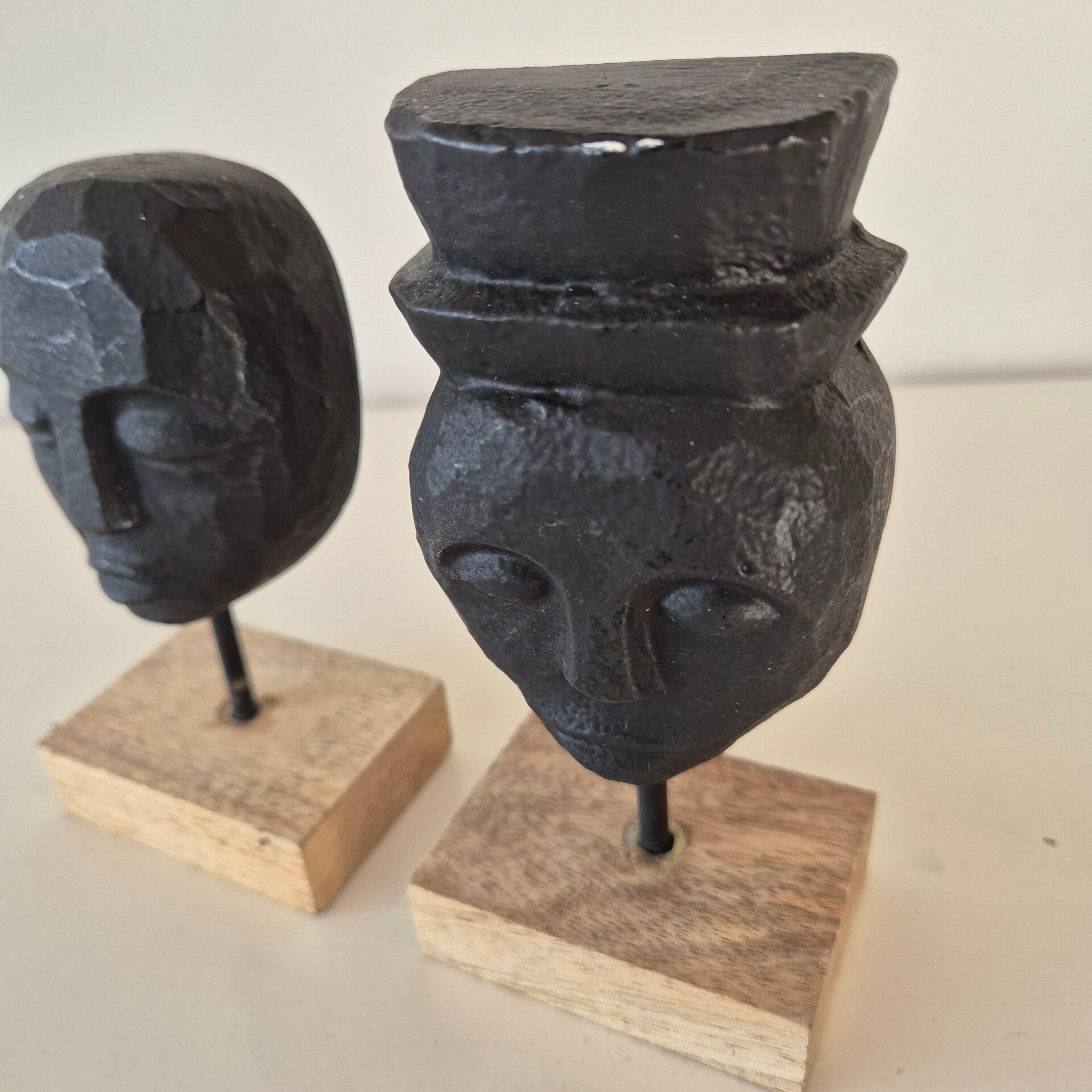 Een stijlvolle set van twee abstracte decoratieve beelden. De koppen hebben een stoere, gebeitelde uitstraling in mat zwart en staan op een stevige voet van authentiek mangohout.