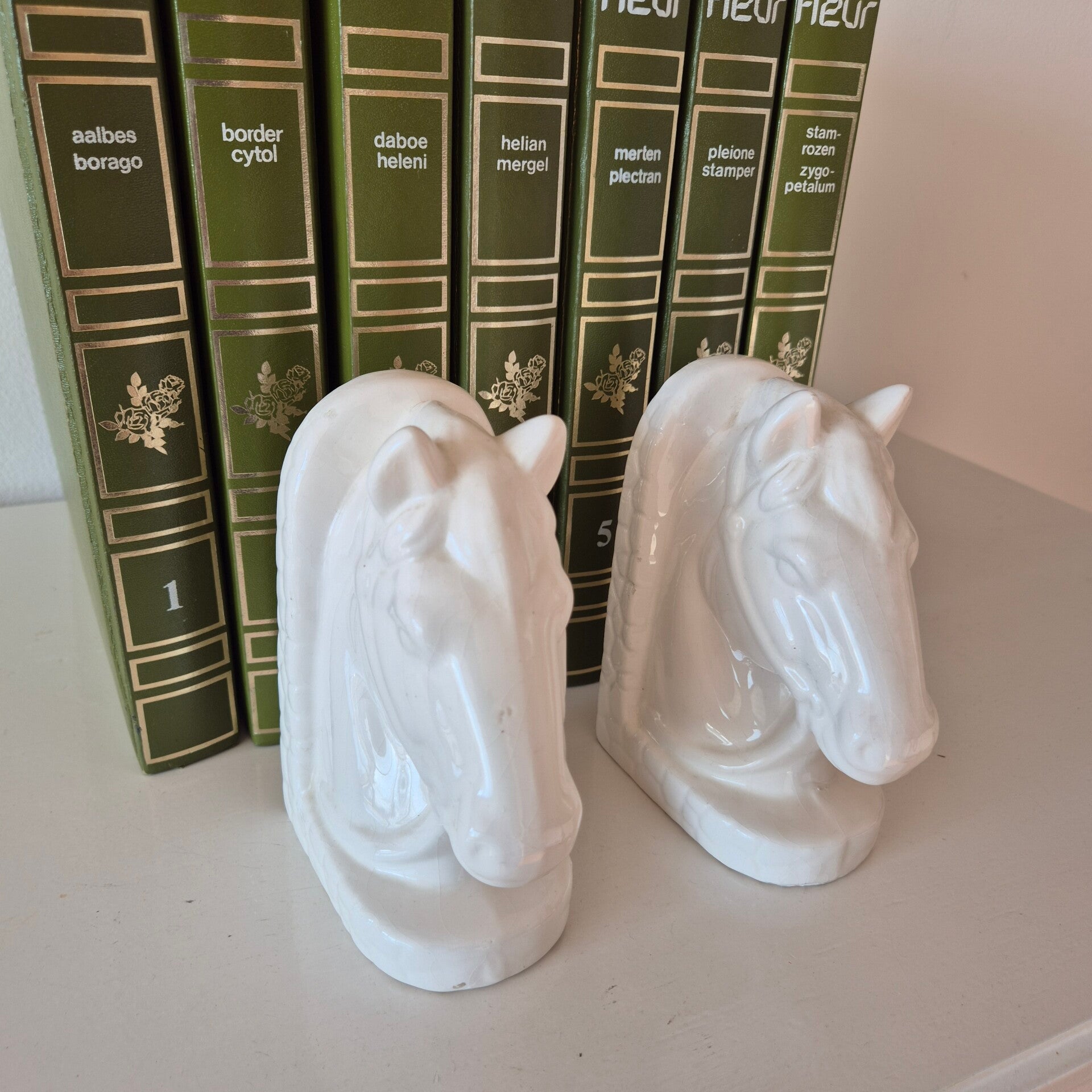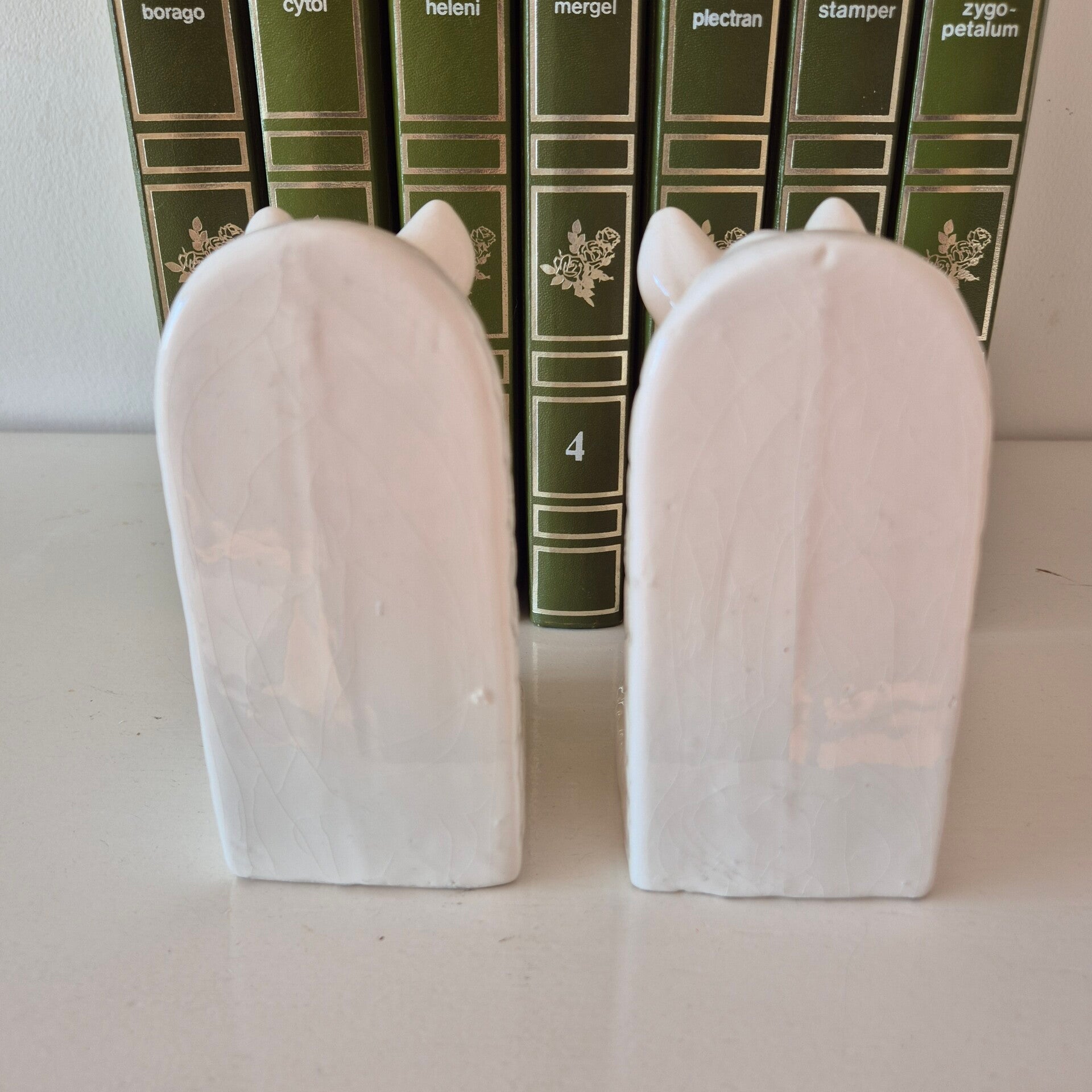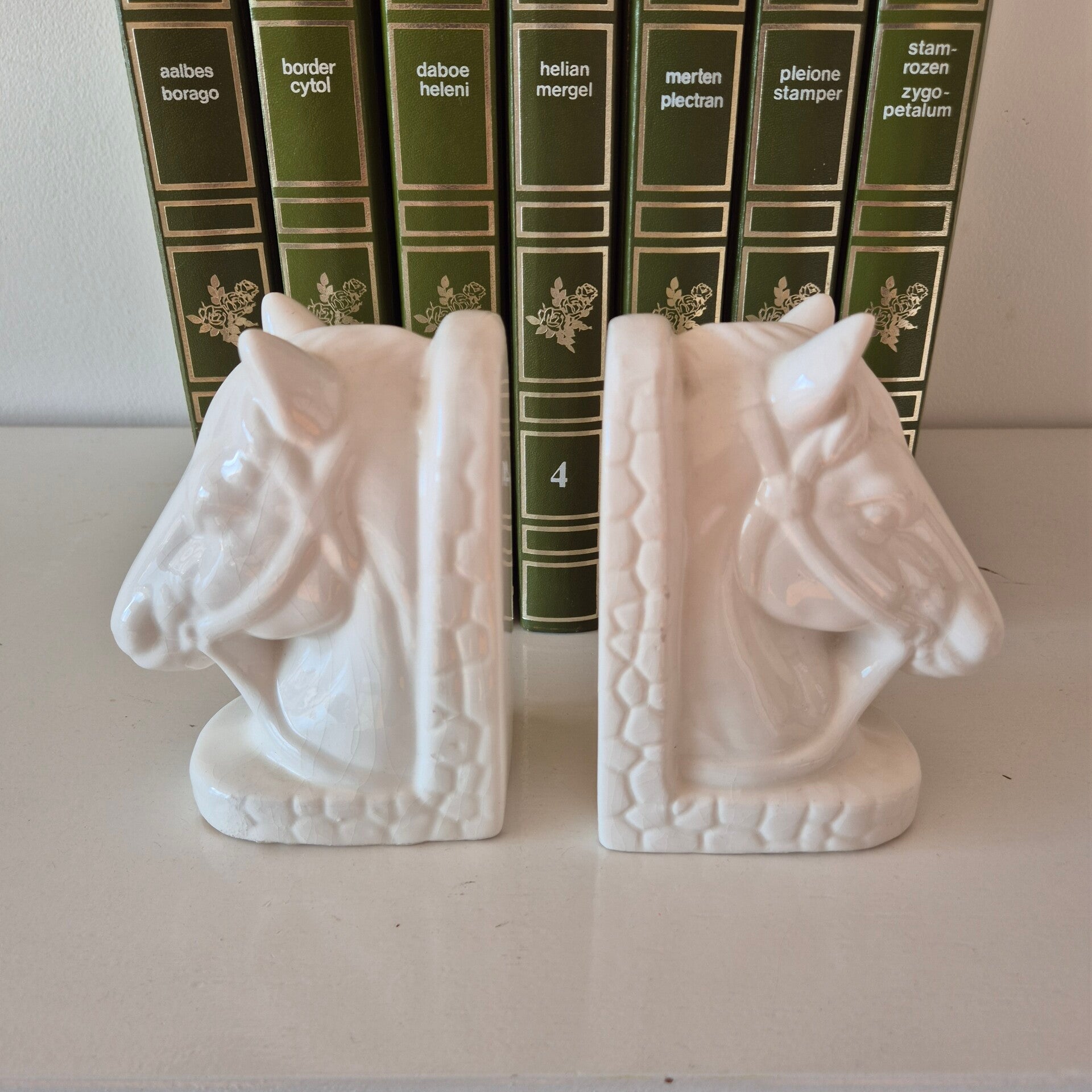 Of ze nu een rij vintage boeken op hun plek houden in de kast, of als losse decoratieve objecten op een dressoir staan: ze trekken direct de aandacht. De subtiele 'craquelé' in het witte glazuur geeft deze set die authentieke vintage uitstraling waar we zo van houden.