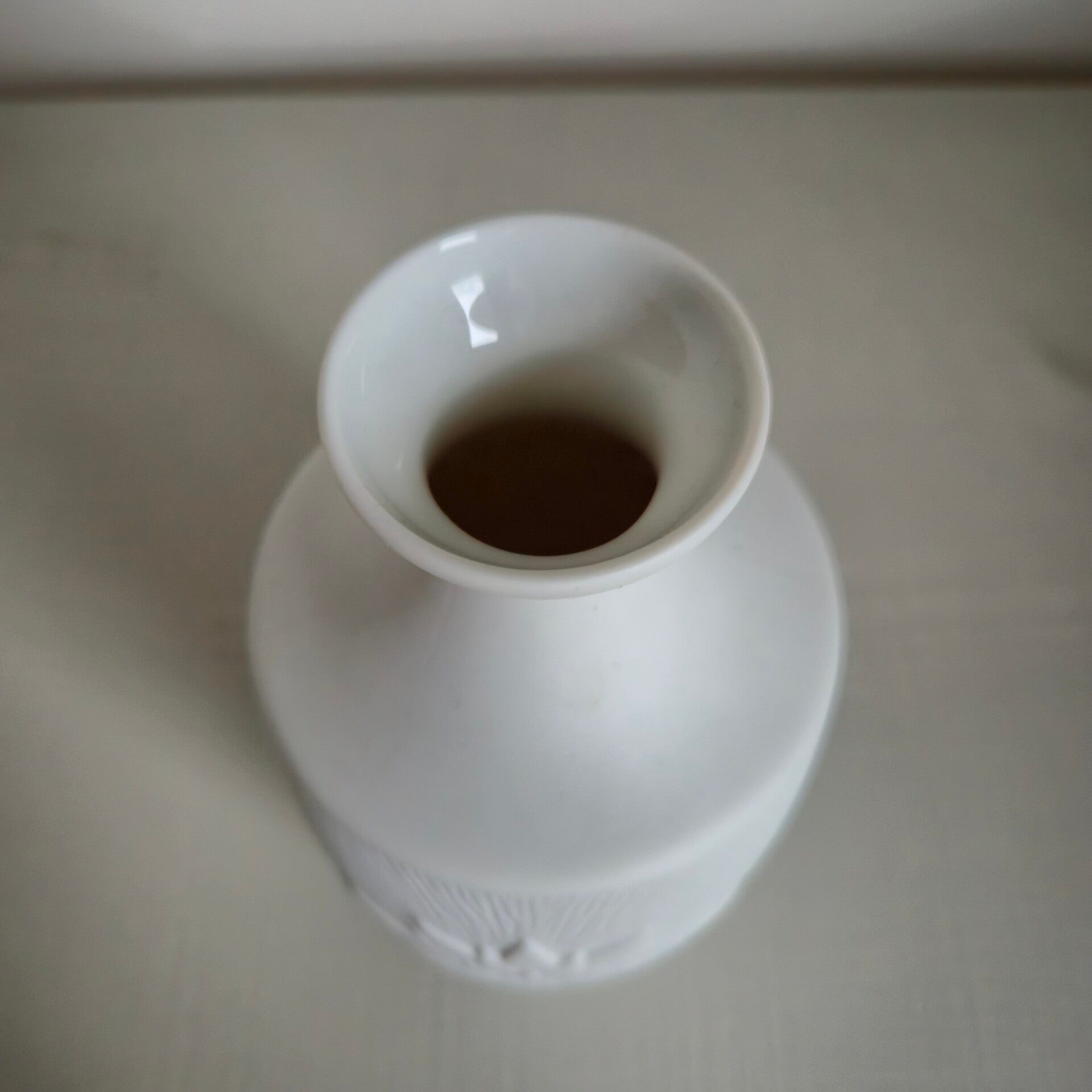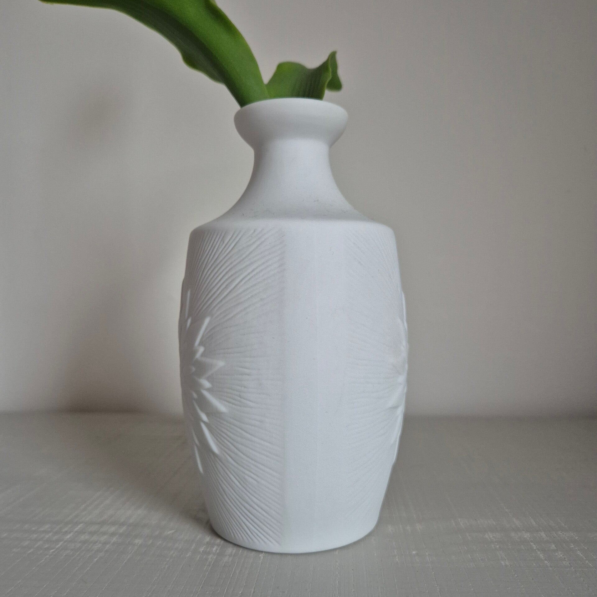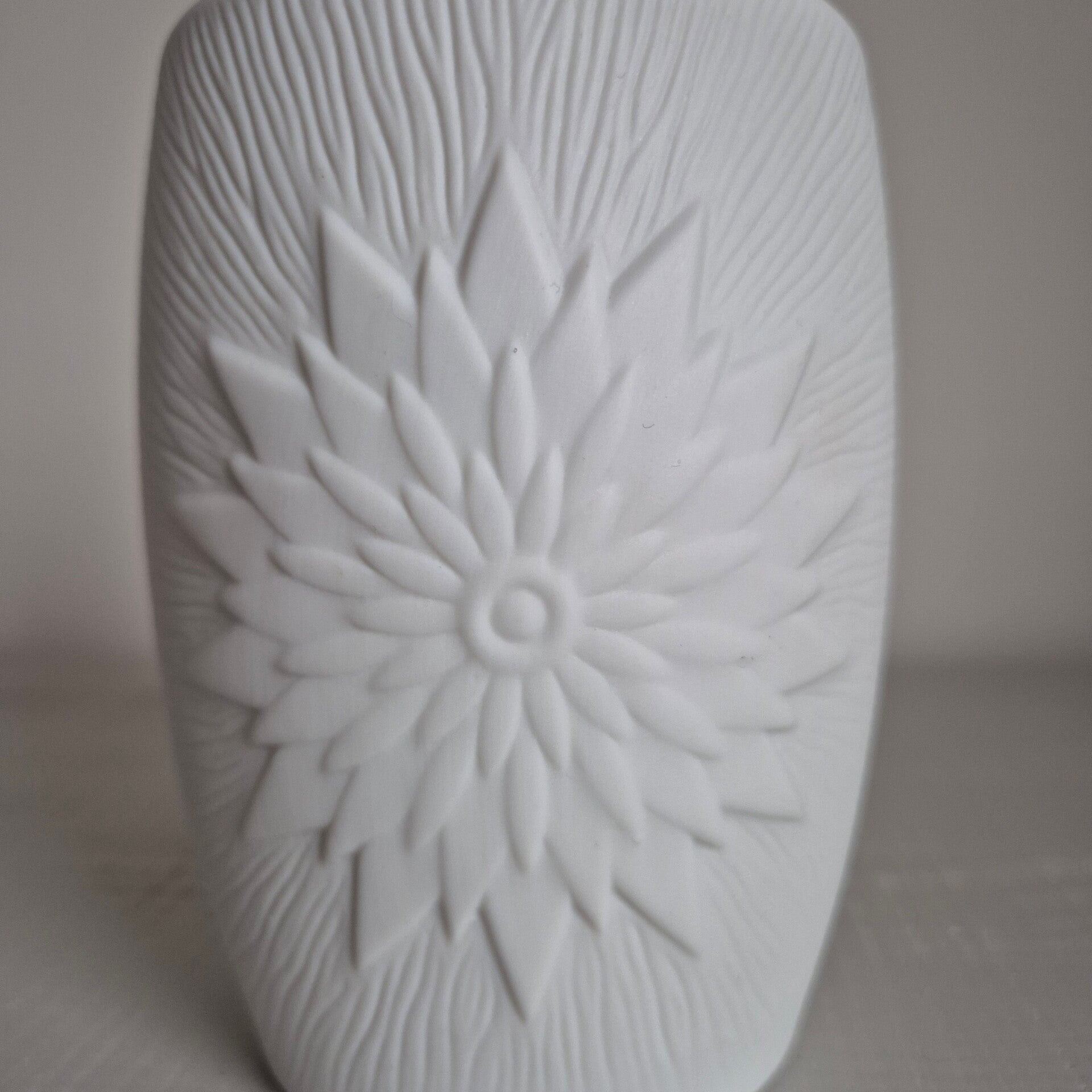 Het vaasje valt op door het gedetailleerde reliëf van een gestileerde zonnebloem of dahlia, waarvan de bladeren overgaan in stralende, verticale lijnen. Het contrast tussen het strakke witte porselein en het schaduwspel van het reliëf geeft dit object een sculpturale kwaliteit.