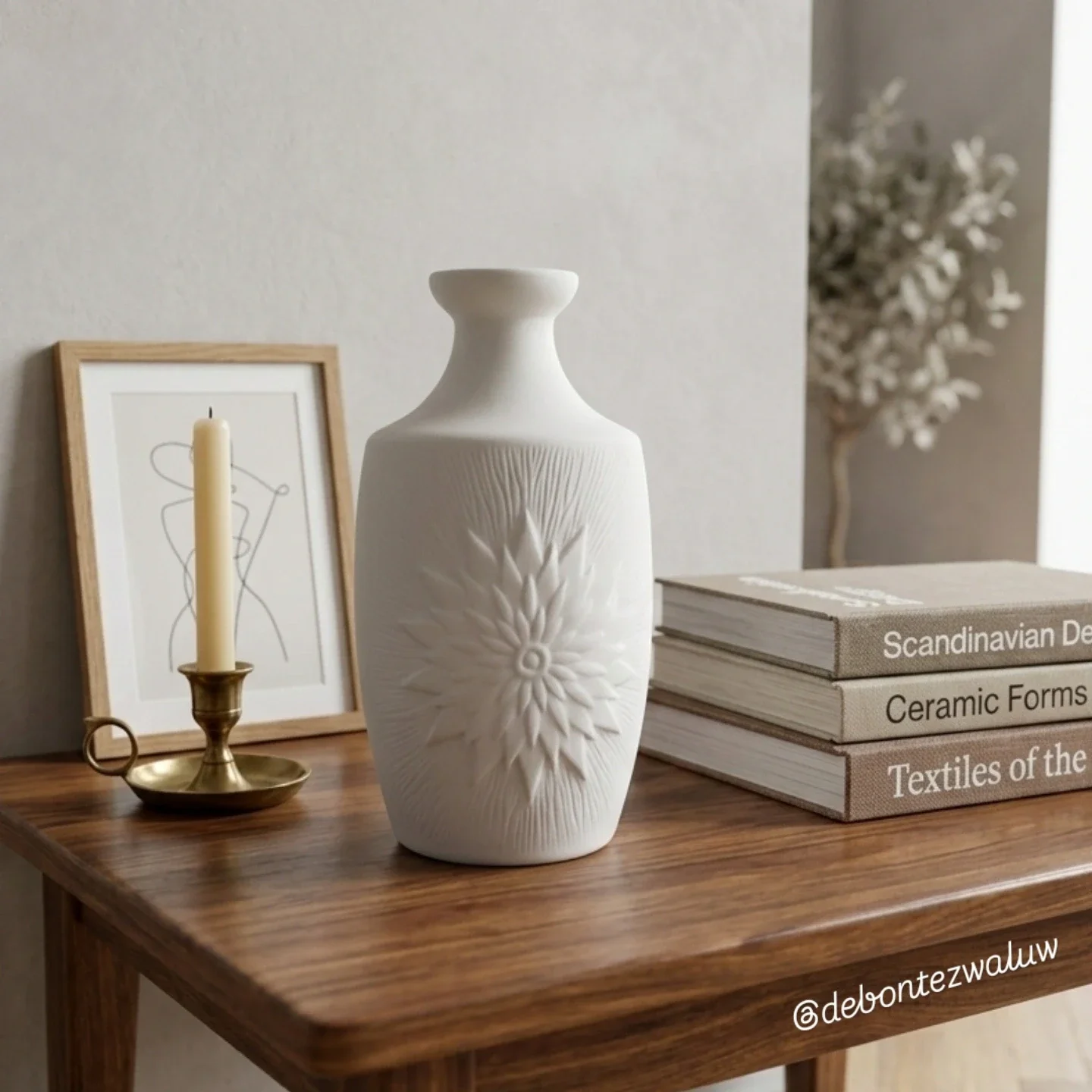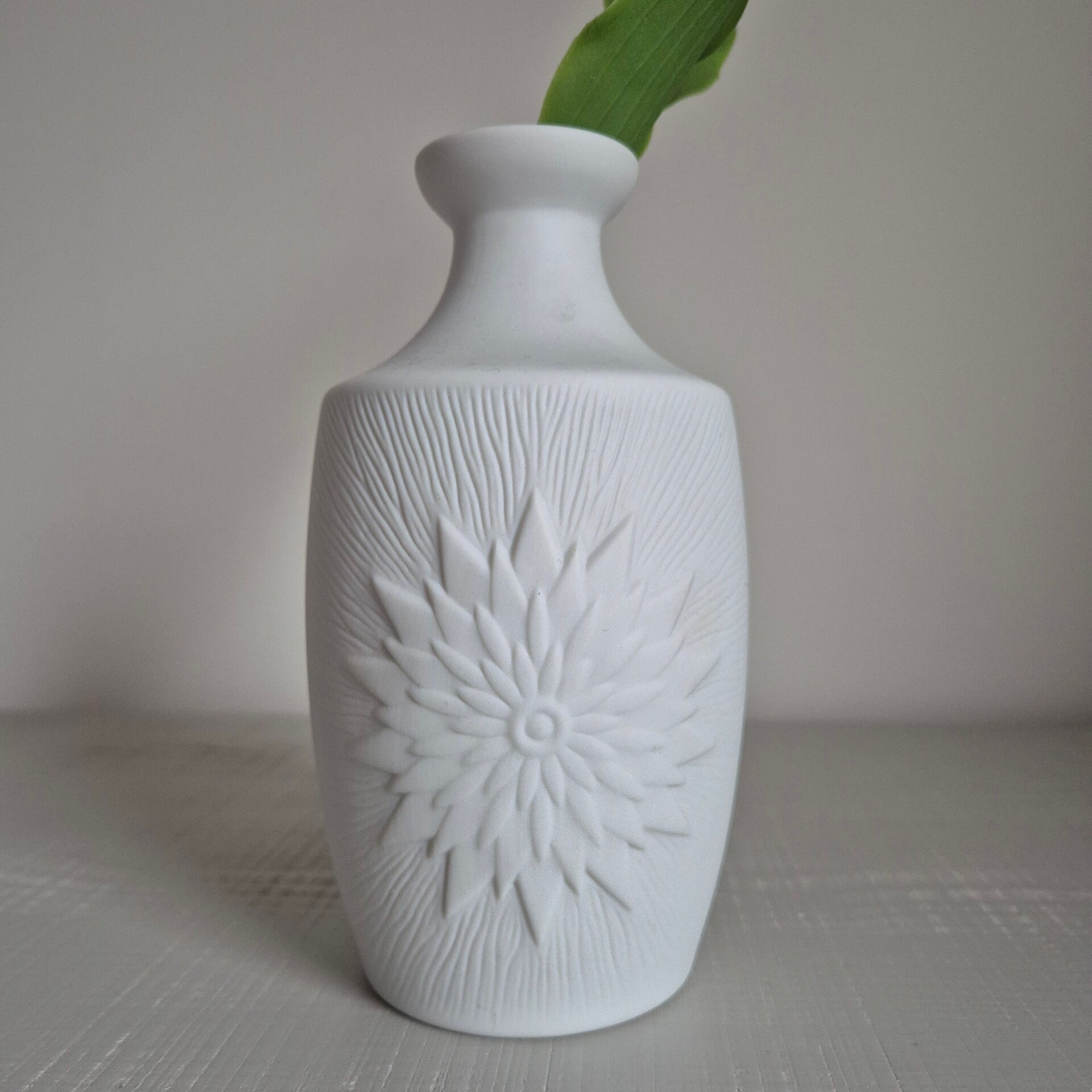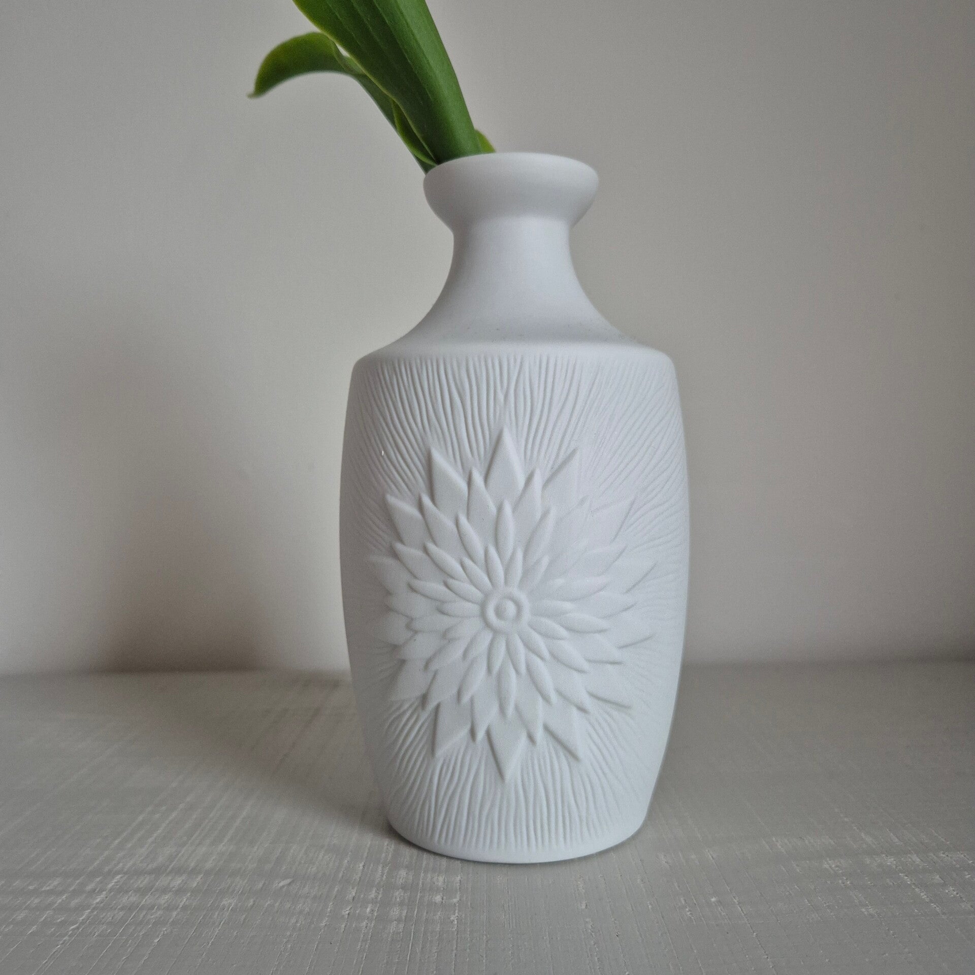 Het vaasje valt op door het gedetailleerde reliëf van een gestileerde zonnebloem of dahlia, waarvan de bladeren overgaan in stralende, verticale lijnen. Het contrast tussen het strakke witte porselein en het schaduwspel van het reliëf geeft dit object een sculpturale kwaliteit.