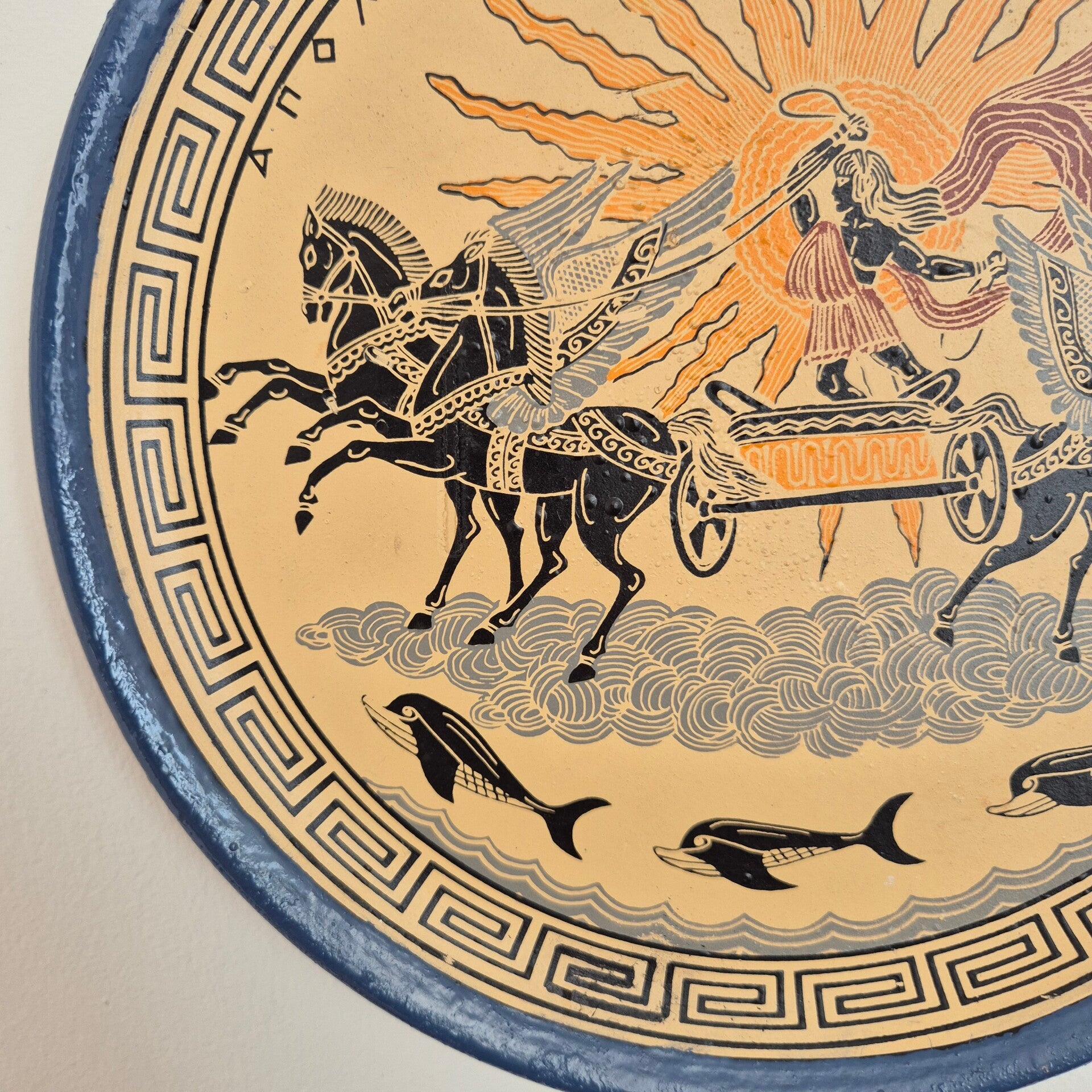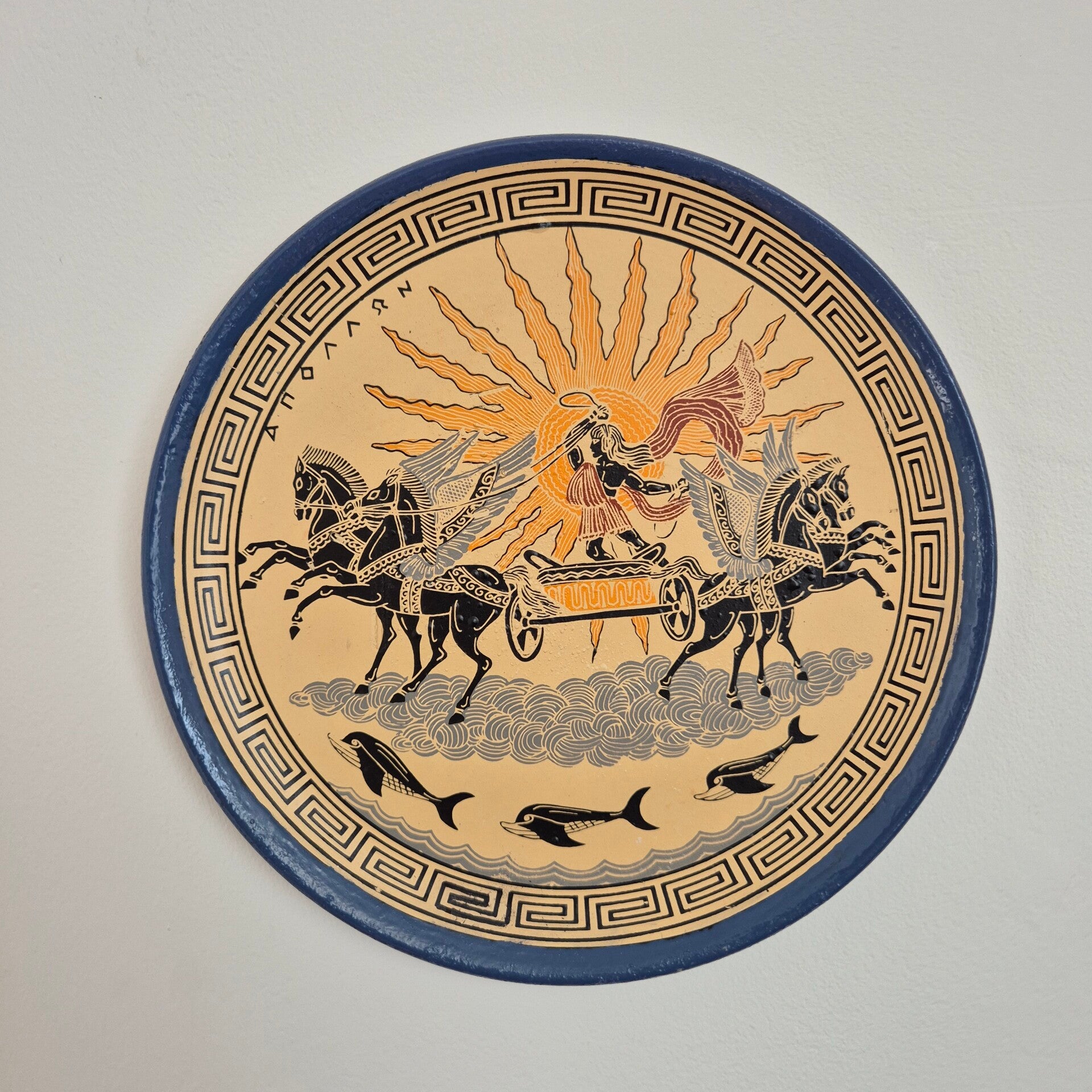 "Breng een stukje Griekse mythologie in huis met dit prachtige handgemaakte wandbord. Dit bord toont de god Apollo die met zijn zonnewagen door de wolken rijdt, omringd door klassieke Meander-details en dolfijnen. Een echte eyecatcher voor een eclectisch of klassiek interieur!"