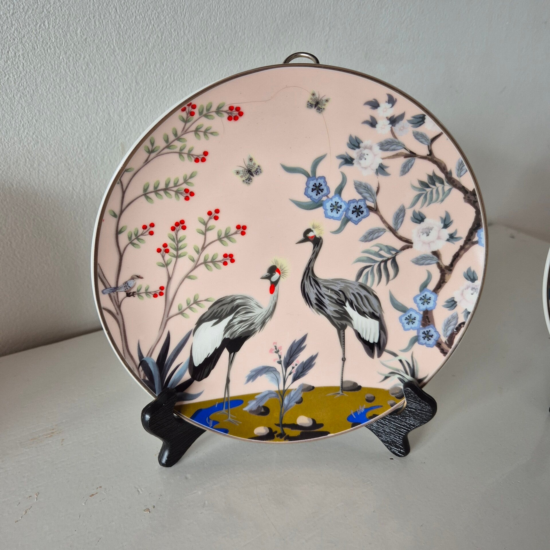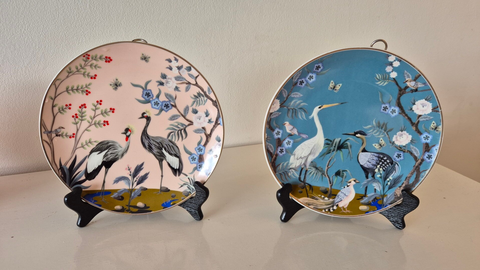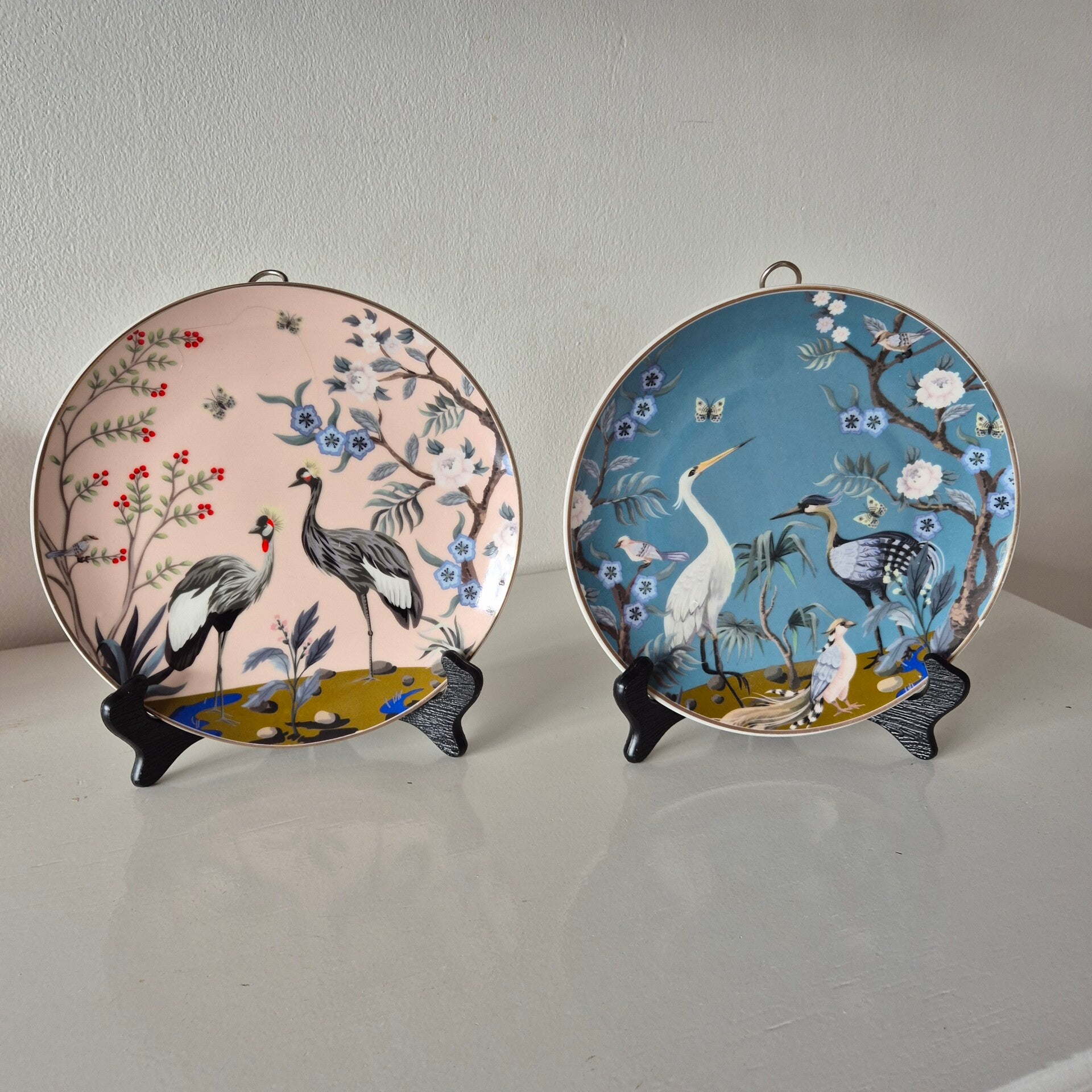 Breng een vleugje tijdloze elegantie in huis met deze prachtige set van twee decoratieve wandborden. Deze borden zijn uitgevoerd in de geliefde Chinoiserie-stijl, gekenmerkt door de verfijnde illustraties van kraanvogels, reigers en delicate bloesemtakken tegen een zachte pastelkleurige achtergrond.
